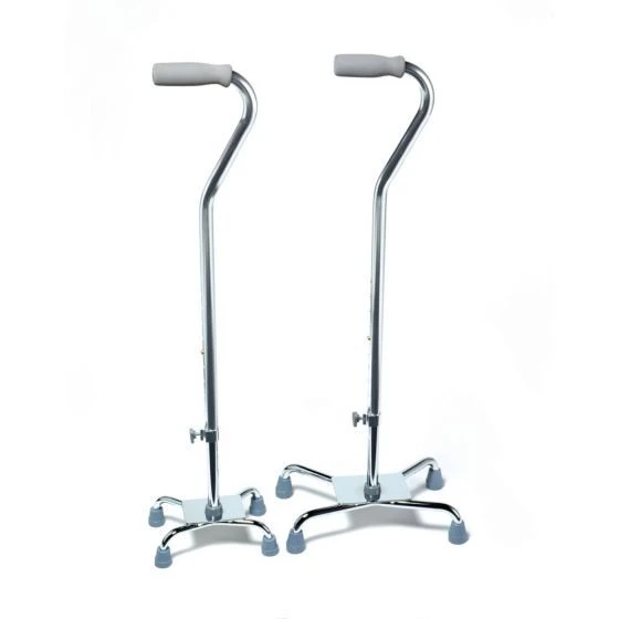 The lightweight quad cane provides reliable support throughout the day. The narrow base quad cane weighs less than two pounds, making it ideal for those who aren’t strong enough to wield a heavier cane. The wide base quad cane is recommended for individuals who need extra stability as they walk. Each support cane’s height can be adjusted to fit any user and uses cane tips to prevent slipping and sliding during use.