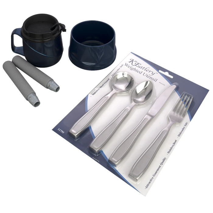 The Parkinson’s Deluxe Weighted Kit features the best products for people with Parkinson’s disease or other illnesses that cause tremors. It includes a KEatlery Weighted Utensil Set, a weighted and insulated bowl and cup, an adult Universal Holder, and a large Universal Holder. The weighted items offer stability.