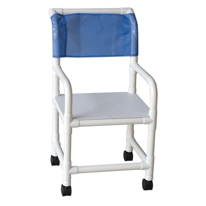 The Shower Chair with Flatstock Seat is an 18″ wide shower chair that has a flatstock seat with drain holes. As well as locking brakes on all 3″ casters for extra…