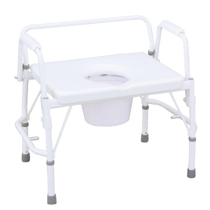 This bariatric commode features an easy-to-release arm mechanism to allow for safe lateral patient transfers to and from commode. The commode can be used at a patient’s bedside as a toilet safety frame or as a raised toilet. Constructed of a welded polyester-coated steel frame that is sturdy and durable enough to support up to 700 lbs. The rubber ferrules at the bottom of each leg provide added stability and prevents the chair from moving on slippery surfaces.